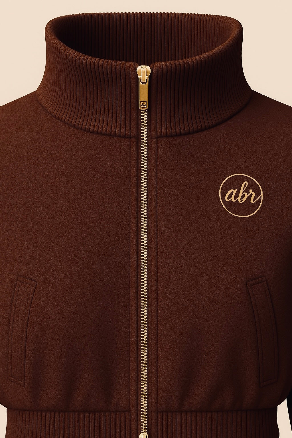 The cropped zip jacket features gold hardware and ribbed cuffs, paired with high-waisted compression pants that lift and contour your body. Each pre-order also includes a matching logo headband for a complete, coordinated look.