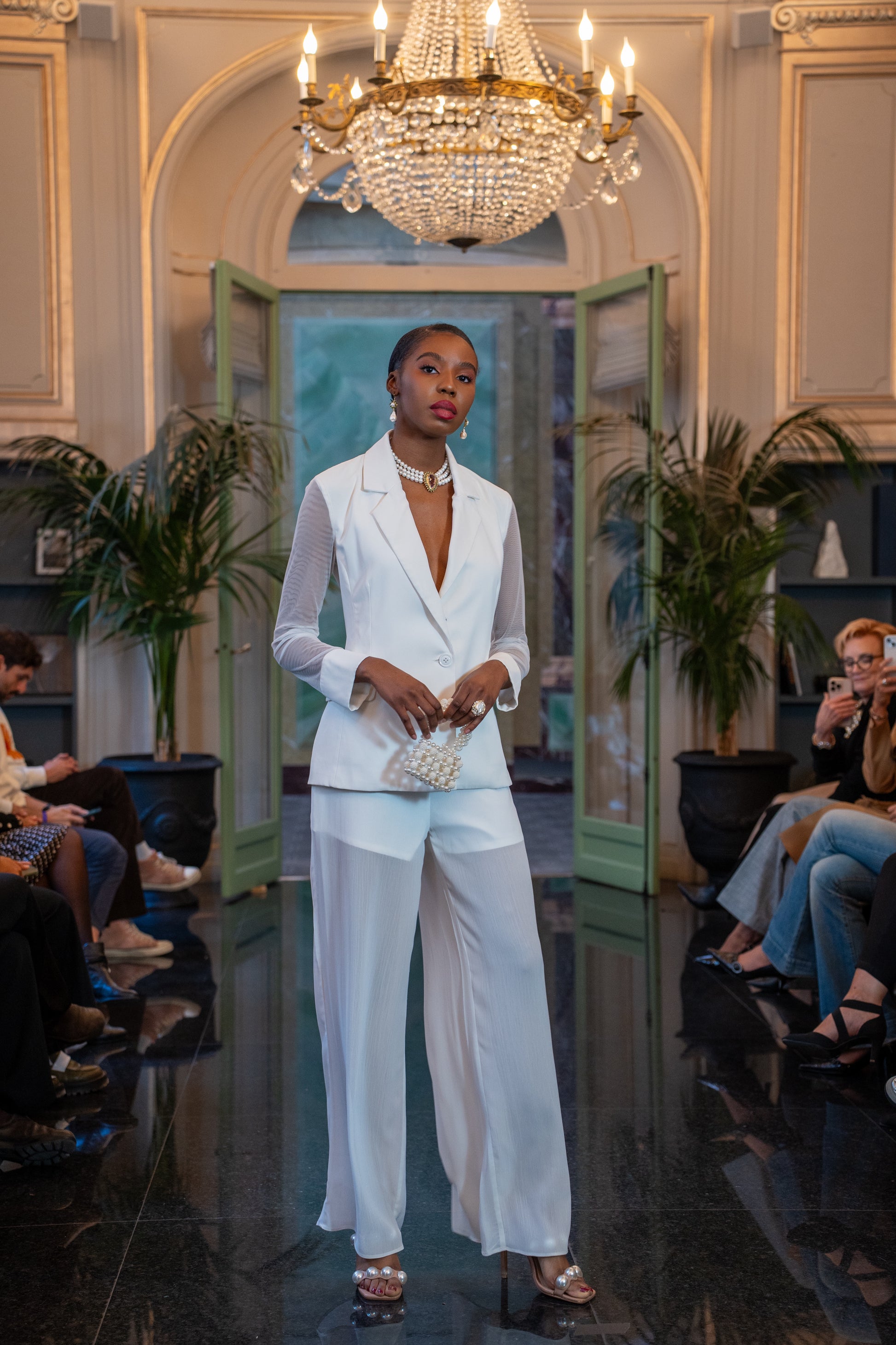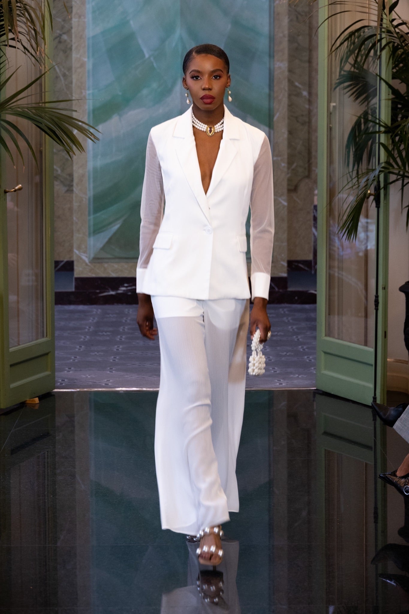 • Wide-leg half-sheer pants for movement, elongation, and polish
