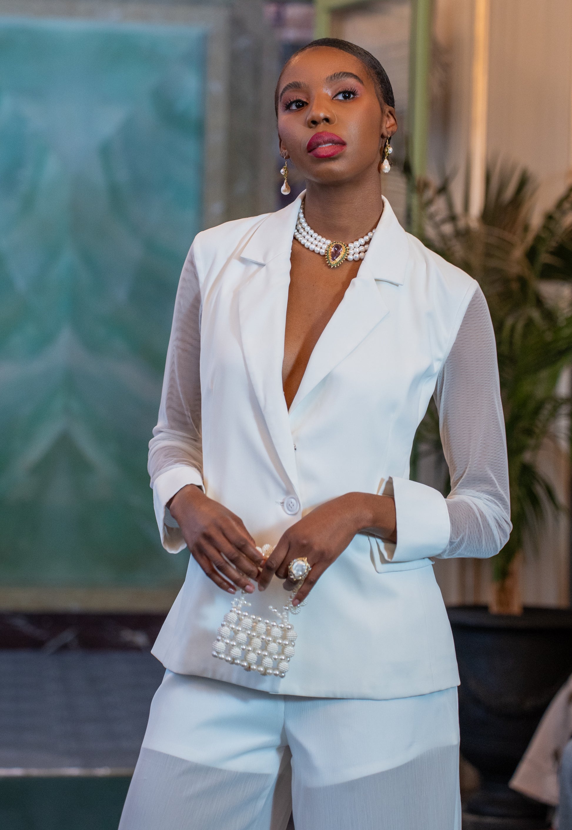 Elegant. Confident. Commanding. The Legacy Set redefines modern power suiting with a fresh, feminine twist. A structured blazer with sheer mesh sleeves pairs with fluid wide-leg trousers, creating a pristine white ensemble that moves with grace and intention. Perfect for women who lead with poise, purpose, and presence.