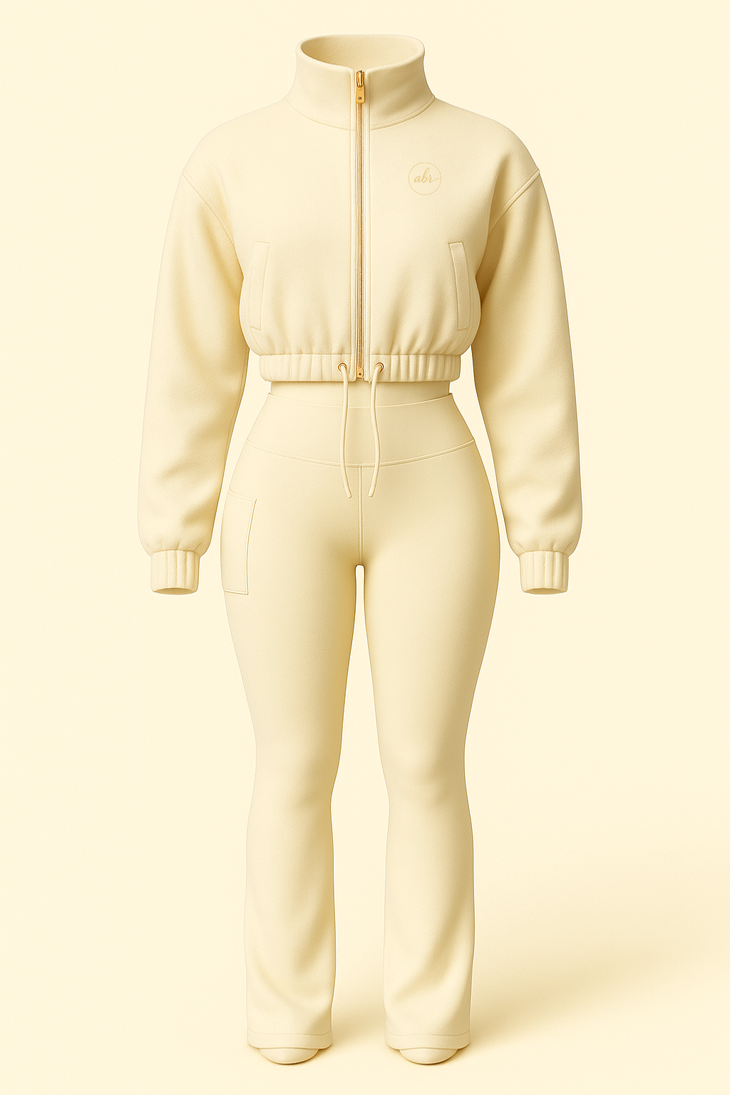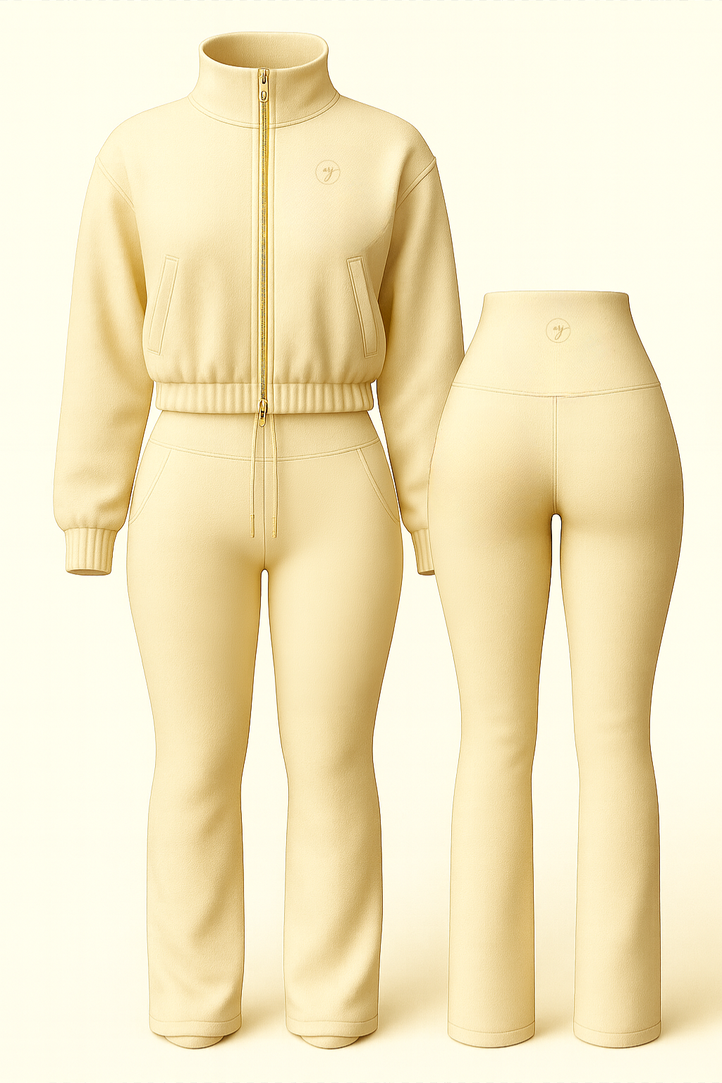 The cropped zip jacket features gold hardware and ribbed cuffs, paired with high-waisted compression pants that lift and contour your body. Each pre-order also includes a matching logo headband for a complete, coordinated look.